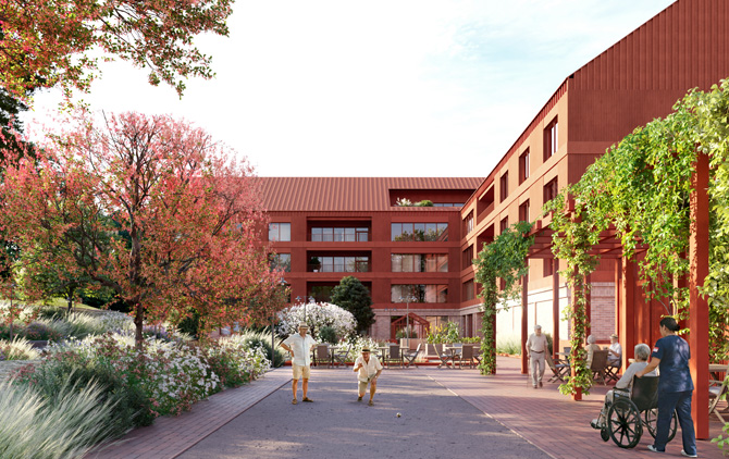 Arkitektoniskt präglas byggnaden av ett stadsmässigt uttryck men med tydlig koppling till omgivande natur. Fasaden utformas med en sockelvåning i tegel och en matrisgjuten röd fasad ovanför, vilket ger byggnaden en varm och robust karaktär. Projektet är ytterligare ett steg i Sehlhalls ambition att utveckla långsiktigt hållbara omsorgsfastigheter med högsta kvalitet för både brukare och kommuner.