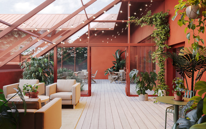 På taket skapas en gemensam mötesplats med lounge, sportbar samt frisör och spa i anslutning till en stor takterrass med orangeri. Utemiljön blir en central del av upplevelsen, med växthus, vattendamm, utekök, pergola, utegym och varierade gångslingor som uppmuntrar till rörelse och vistelse utomhus.